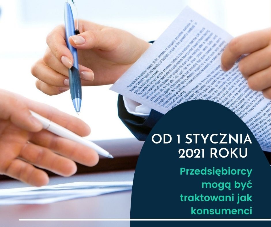 Osoby fizyczne prowadzące jednoosobową działalność gospodarczą będą korzystać z ochrony przewidzianej dla konsumentów – zmiany w prawie od 1 stycznia 2021 r. Nowelizacja Ustawy o prawach konsumenta i Kodeksu cywilnego znacząco zmieni dotychczasową rzeczywistość prawną. Co to oznacza? Osoby fizyczne prowadzące działalność gospodarczą zyskają nowe przywileje i dodatkową ochronę konsumencką, czyli będą traktowane jak konsumenci. W związku z tym zostaną objęte ochroną przewidzianą dla konsumentów, mimo że są przedsiębiorcami.