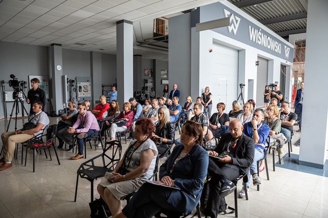 Termin Przemysłu 4.0 został zdefiniowany w 2011 roku. Moment ten nie był jednak początkiem czwartej rewolucji przemysłowej, bo ta zaczęła się znacznie wcześniej. WIŚNIOWSKI już w 2004 roku posiadał pierwszą maszynę, która wykorzystywała rozwiązania automatyzacji i robotyzacji produkcji. – Przemysł 4.0 zapewnia tym procesom tzw. paliwo do działania – dane, generowane w sposób automatyczny już na etapie kontaktu z klientem, przesłane do maszyn poprzez systemy bazodanowe i szereg narzędzi IT. Po drugiej stronie mamy „silniki”, maszyny dedykowane do produkcji wyrobu, a między nimi stanowiska zrobotyzowane. Najczęściej wykonują prace precyzyjne, wymagające dużej powtarzalności, monotonne lub szkodliwe dla zdrowia człowieka – tłumaczył Tomasz Długopolski, Dyrektor Rozwoju Technologicznego w firmie WIŚNIOWSKI. Na zdjęciu poniżej, dziennikarze na konfrenecji podczas obchodów 30-lecia firmy