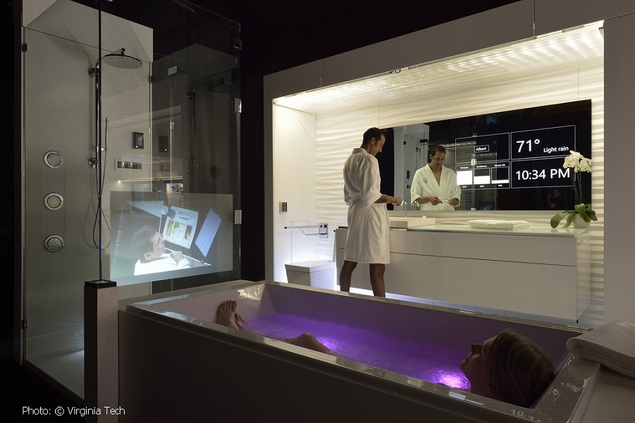 Najnowsze technologie wkradły się również do sklepowych przymierzalni. Dla tych, którzy nie lubią gimnastyki w ciasnej kabinie lub mają zbyt mało czasu na kilkukrotną zmianę stylizacji, idealnym rozwiązaniem są wirtualne przymierzalnie. Dzięki ukrytemu pod taflą lustra ze szkła MirroView™ cyfrowemu nośnikowi oraz kamerze z czujnikami 3D, na odbijającą się w lustrze sylwetkę „zakłada” się dostępne w wirtualnej sklepowej bazie ubrania, bez wysiłku i w bardzo krótkim czasie. Pozwala to na szybkie podjęcie zakupowych decyzji i ogranicza czas spędzony na żmudnym dobieraniu stylizacji.