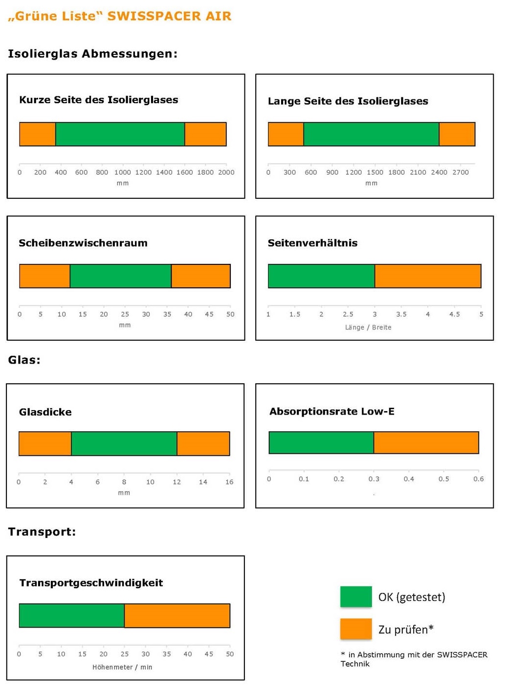 SWISSPACER daje producentom szkła zespolonego wskazówki, które pomogą sprawdzić niezawodność zastosowania SWISSPACER Air. „Na podstawie symulacji i obliczeń analitycznych przy współpracy ift Rosenheim stworzyliśmy bazę danych roboczo nazwaną „Zieloną listą”, która definiuje wymiary szkła izolacyjnego w granicach którego zastosowanie naszego rozwiązania jest godne polecenia” mówi Henseler.