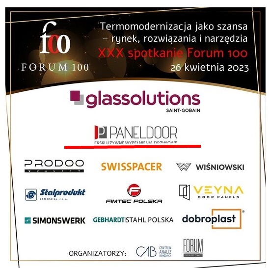 Wiodący producent paneli drzwiowych firma Paneldoor była jednym ze strategicznych partnerów Forum 100, które odbyło się w Warszawie 26 kwietnia 2023 r. Wydarzenie przebiegało pod hasłem: „Modernizacja jako szansa – rynek, rozwiązania i marketing”.