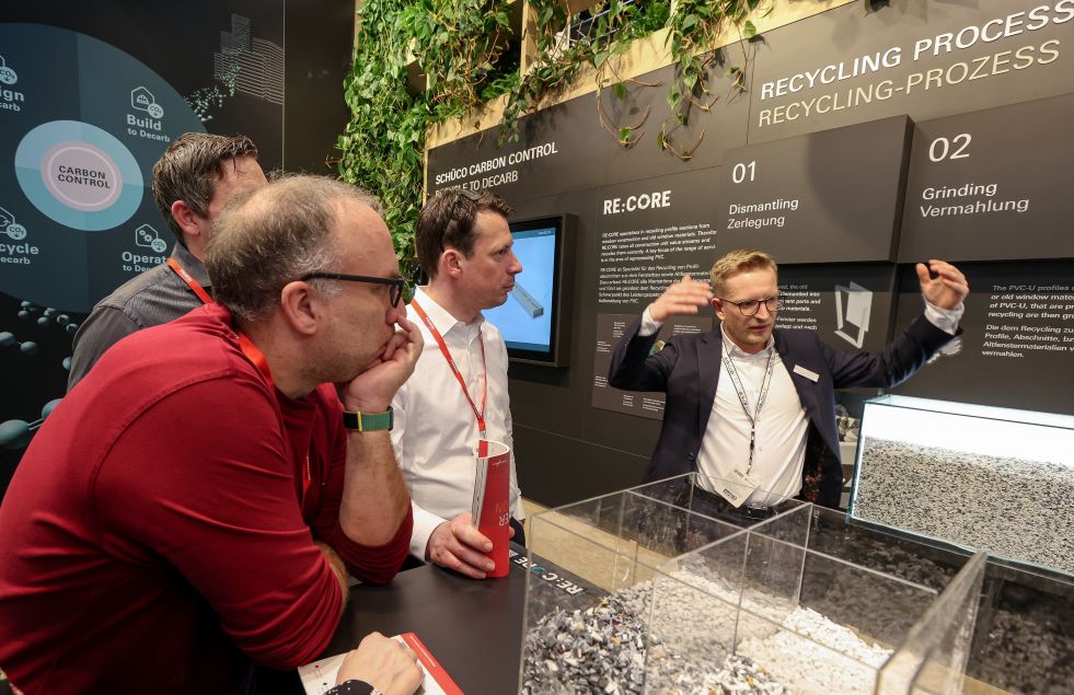 Wszystkie profile okienne Schüco już teraz w podstawowej ofercie zawierają od 25 do nawet 75% szarego recyklatu. Stałe zwiększanie zawartości surowców z odzysku jest możliwe dzięki współpracy firmy ze spółką-córką RE:CORE zajmującą się pozyskiwaniem i przetwarzaniem tworzywa pochodzącego ze starych okien lub odpadów produkcyjnych. Na części stoiska można było zobaczyć zarówno recyklat w różnych fazach przetworzenia, jak i produkowane z jego użyciem profile. Charakterystyczne, szare tworzywo jest widoczne tylko na wewnętrznych częściach profilu, podczas gdy ich zewnętrzne powierzchnie mogą przyjąć jeden z ponad 300 kolorów UnlimitedFinish. W tym roku wzbogaciły się one o zupełnie nowe metaliczne odcienie Mattex, które doskonale oddają wygląd i strukturę powierzchni aluminiowych, także pod względem twardości, co chętnie sprawdzali odwiedzający na efektownych rozmiarów wzorniku.